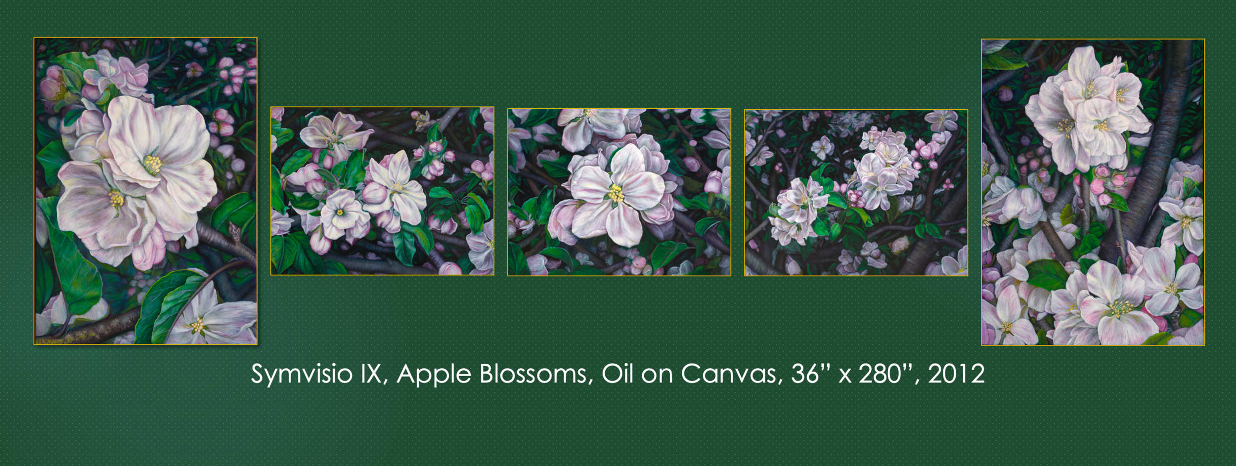 When I started the symvisio series, I was hoping to complete at least nine symvisio. The reason behind that number was the work of my favorite western composer Ludwig Von Beethoven. He had written nine symphonies. So, I had to paint at least nine symvisios, with the symvisio IX as an homage to his Ninth symphony. I had a dream that I was in a mosque, which turned into a cathedral made out of flowers. That inspired me to base my ninth symvisio on a phrase from the “Ode to Joy,” apple blossom.